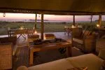 Das intime Camp mit nur vier Zelten steht auf einer Insel von Maulbeerfeigenbäumen. Gut beschützt unter einem großen Zeltdach stehen die Lounge und Bar, ein wenig davon entfernt der Speisebereich mit seinem außergewöhnlichen Kronleuchter.