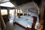 Das kleine Camp von Wilderness Safaris hat nur vier Zelte. Die klassischen Safarizelte mit Wänden und Dach aus Leinwand stehen auf einem festen Boden und haben eine private Dusche/WC. Die Einrichtung ist rustikal mit einem großen, schweren Himmelbett. Besonders schön ist die Veranda unter einem Holzdach mit Stühlen und einer Hängematte