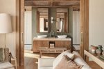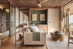 Die Suiten haben eine Größe von ca. 120 qm, die sich zu gleichen Teilen in Innen- (61 m²) und Außenbereiche (58 m²) aufteilen. Im Inneren finden Sie Schlaf- und Wohnbereich und das Badezimmer mit Regendusche.