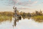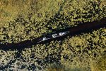 Mit einem kleinen Flugzeug geht es weiter. Der Kontrast zur trockenen Region der Makgadikgadi Pans könnte nicht größer sein. Seerosen sprenkeln die glitzernden Wasserflächen und durch sumpfige Flächen waten Tiere.