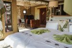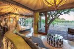 Zur Ausstattung der Suiten gehören private Veranda mit Liegen und Sessel und herrlicher Aussicht in die Savanne, Klimaanlage, Wifi, Bad mit Innen- und Außendusche, Minibar, Tee- und Kaffeezubereitung und Safe.