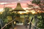 Das Haupthaus der Luxuslodge steht inmitten von Mopanebäumen, eine kleine Oase in dieser harschen Landschaft. Über einen geschwungenen Holzsteg, der durch das (nach der Regenzeit) hohe Gras und um knorrige Bäume führt, gelangt man vom Tor zum Haupthaus.