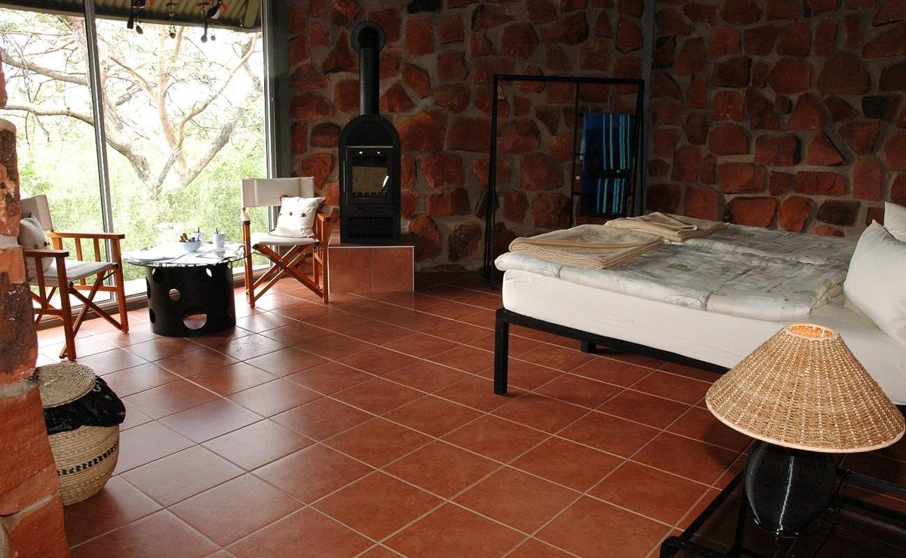 Die sieben Chalets bieten einen grandiosen Blick über die tiefgrüne Buschsavanna der Kalahari. Sie stehen weit entfernt voneinander zwischen roten Sandsteinfelsen und grünem Busch. Für kalte Abende haben die Chalets einen Kamin, für heiße Nachmittage auf der Terrasse ein kleines Tauchbecken, gefüllt mit Quellwasser.