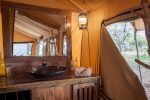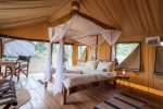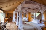 Die großzügigen Zelte haben einen Holzboden, romantische Himmelbetten mit Moskitonetzen und ein großzügiges Bad mit Dusche.