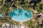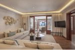 Im tropischen Garten sind hufeisenförmig die Junior Suiten (76 qm) und Senior Suiten Beachfront (148) angeordnet. Im vorderen Teil des Hufeisens liegen die Senior Suiten und Junior Suiten Beachfront, im hinteren Teil des Hufeisens die Junior Suiten. Die Inneneinrichtung wird von ruhigen Beige- und Taupetönen bestimmt. Die Senior Suite Beachfront (147 qm) bieten den wahren tropischen Lebensstil. Sie haben einen großzügigen Wohn- und Schlafbereich und ein ebensolches Badezimmer. Die Suiten sind mit edlen dunklen Hölzern ausgestattet, die einen schönen Kontrast zu den Beige- und Grautönen von Wänden und Accessoires darstellen. Für Familien bieten sich in diesem Bereich die 2-Bedroom Suiten an – die entweder zwei Junior Suiten oder zwei Junior Suite Beachfront miteinander kombinieren (152 qm). Wunderbar für Familien sind die 2-Bedroom Senior Family Suite Beachfront, die Verbindung von Senior Suite mit Junior Suite Beachfront (223 qm).